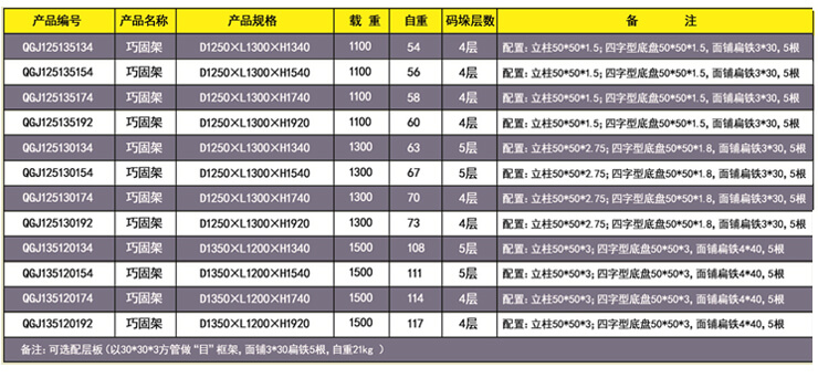 巧固架 產(chǎn)品特點(diǎn):底部碼垛角鐵成80°設(shè)計(jì)促使碼垛的巧固架越壓越緊。