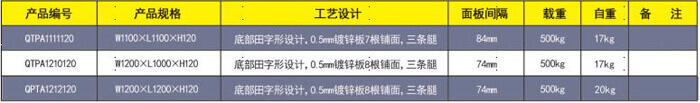 產(chǎn)品編號:QTPA1111120 產(chǎn)品規(guī)格:W1100×L1100×H120 托盤主孔:100mm 托盤側孔:80 mm 產(chǎn)品自重:16 kg 產(chǎn)品靜載:800kg 產(chǎn)品動載:600kg 上貨架載:不建議 產(chǎn)品配置:采用寶鋼鍍鋅板軋機成0.5*10*85 多筋骨面板10根,以間隔84mm 和6根板做腿+9個立撐組成。 產(chǎn)品用途:廣泛用于酒水、食品、化工、電子 等大量物品倉儲與周轉。 產(chǎn)品缺陷:不宜上貨架。
